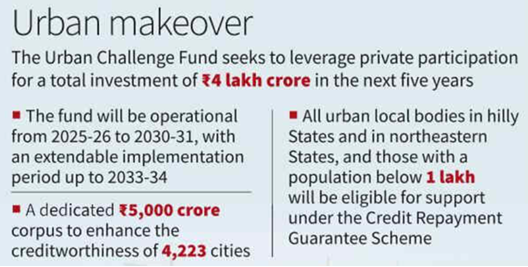₹1 லட்சம் கோடி மத்திய உதவியுடன் நகர்ப்புறச் சவால்கள் நிதியை (UCF) தொடங்குவதற்கு மத்திய அமைச்சரவை ஒப்புதல் அளித்துள்ளது.