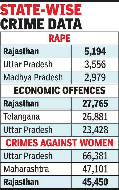 நாட்டில் அதிக எண்ணிக்கையிலான பாலியல் வன்கொடுமை மற்றும் பொருளாதார குற்ற வழக்குகள் இராஜஸ்தானில் பதிவாகியுள்ளன.