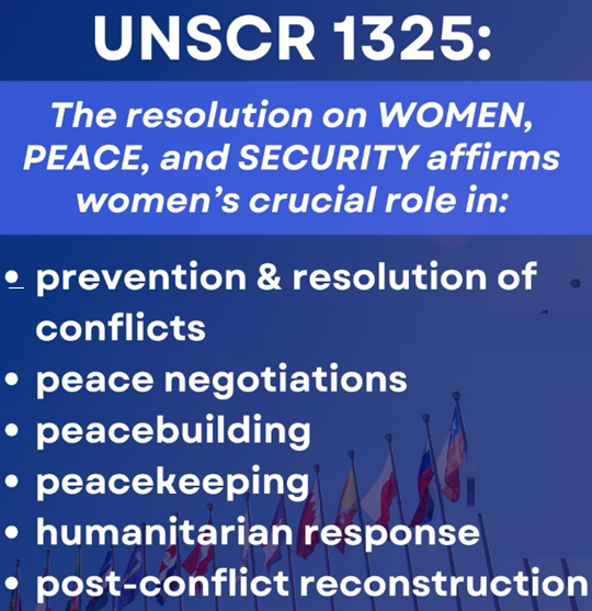 தீர்மானம் 1325 ஆனது, உலகளவில் அமைதியைக் கட்டமைத்தல், மோதல் தடுப்பு மற்றும் மோதலுக்குப் பிந்தைய மீட்பு ஆகியவற்றில் பெண்கள் பங்கேற்பதன் முக்கியத்துவத்தை வலியுறுத்துகிறது.