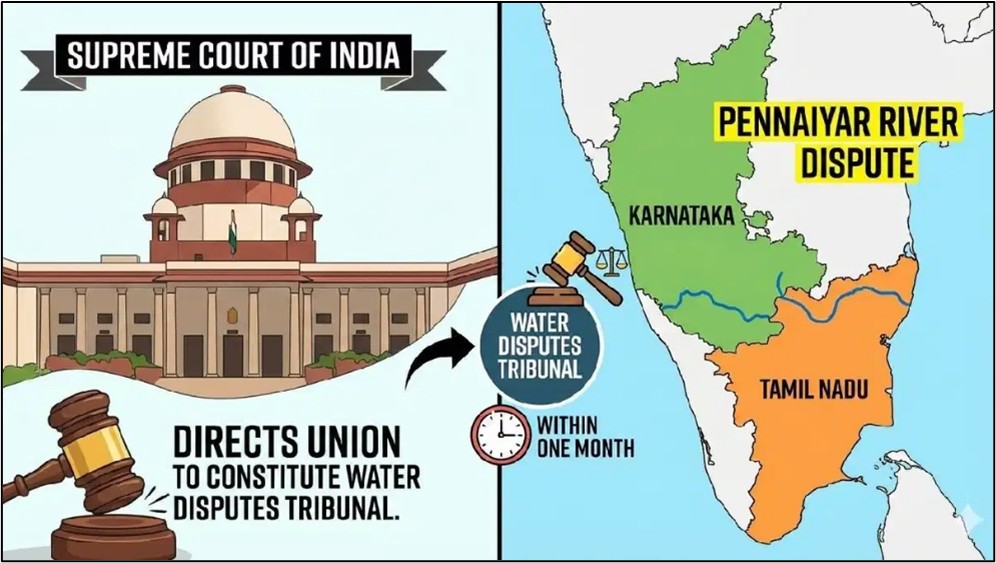 தமிழ்நாடு மற்றும் கர்நாடகா மாநிலங்களுக்கு இடையே உள்ள பெண்ணையாறு நதிநீர்ப் பிரச்சினையைத் தீர்க்க ஒரு தீர்ப்பாயத்தை அமைக்க மத்திய அரசுக்கு உச்ச நீதிமன்றம் உத்தரவிட்டுள்ளது.