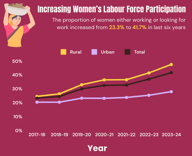 இந்திய அரசானது, பெண் தொழிலாளர் வள பங்கேற்பு விகிதத்தை (FLFPR) 2024 ஆம் நிதியாண்டில் 41.7 சதவீதத்திலிருந்து 2030 ஆம் ஆண்டிற்குள் 55% ஆக உயர்த்துவதை நோக்கமாகக் கொண்டுள்ளது.
