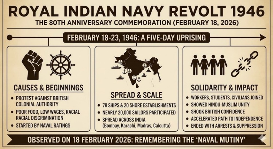 1946 ராயல் இந்தியக் கடற்படை (RIN) கிளர்ச்சியின் 80வது ஆண்டு விழா பிப்ரவரி 18, 2026 அன்று அனுசரிக்கப்பட்டது.