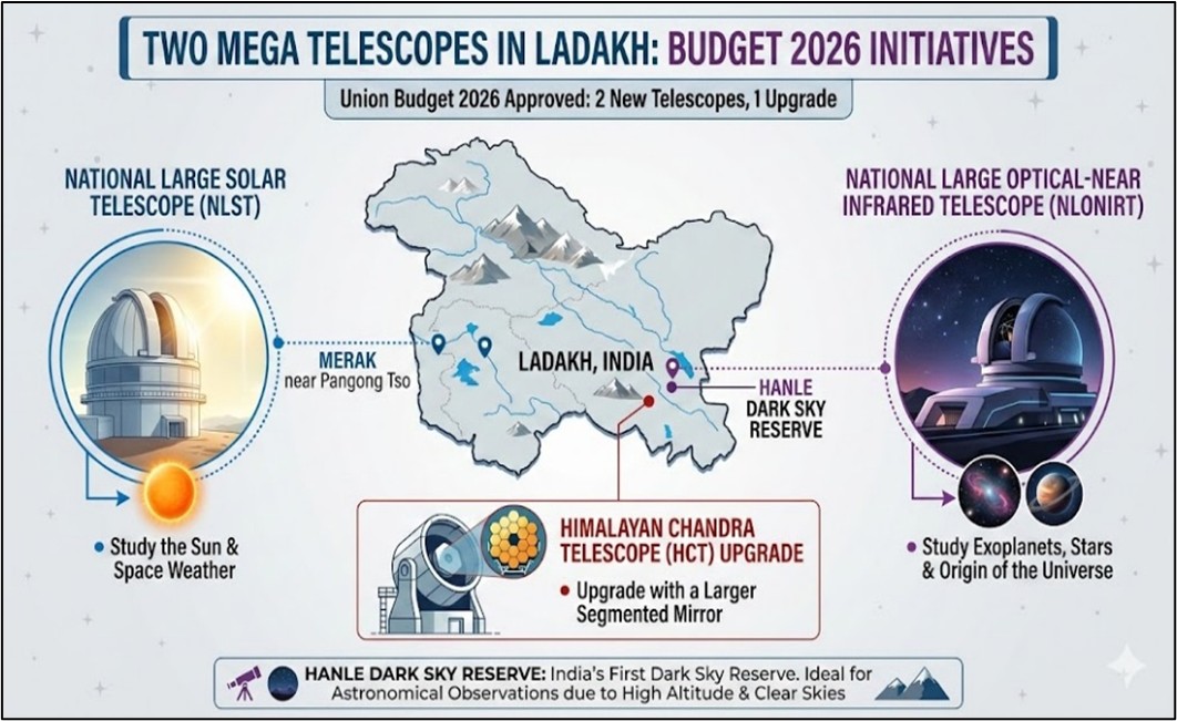 • 2026 ஆம் ஆண்டின் ஒன்றிய நிதிநிலையறிக்கையானது இரண்டு புதிய தொலை நோக்கிகள் மற்றும் லடாக்கில் ஏற்கனவே உள்ள தொலைநோக்கியின் மேம்படுத்தலுக்கு ஒப்புதல் அளித்தது.