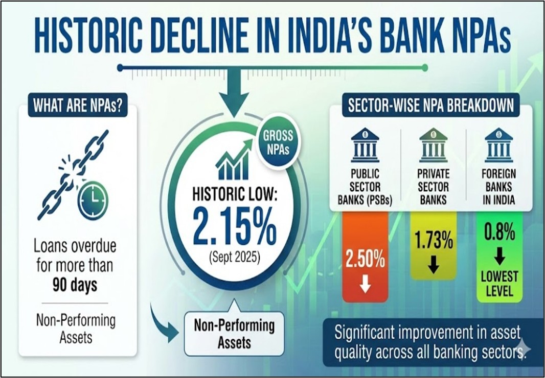 - இந்தியாவின் பட்டியலிடப்பட்ட வணிக வங்கிகளின் மொத்த வராக் கடன்கள் (NPA) செப்டம்பர் 2025 இல் மிகக் குறைந்த அளவான 2.15% ஆகக் குறைந்தன.