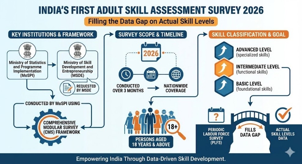 • இந்தியா தனது முதல் நாடு தழுவிய வயது வந்தோர் திறன் மதிப்பீட்டு ஆய்வை 2026 ஆம் ஆண்டில் நடத்த உள்ளது.