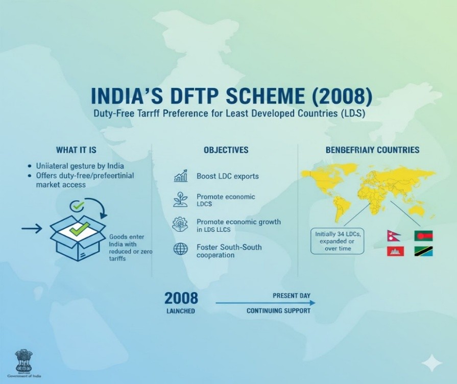 இந்தியாவின் வரி இல்லாத சுங்கக் கட்டண முன்னுரிமைத் திட்டம் (DFTP) ஆனது 2008 ஆம் ஆண்டில் தொடங்கப்பட்டது.