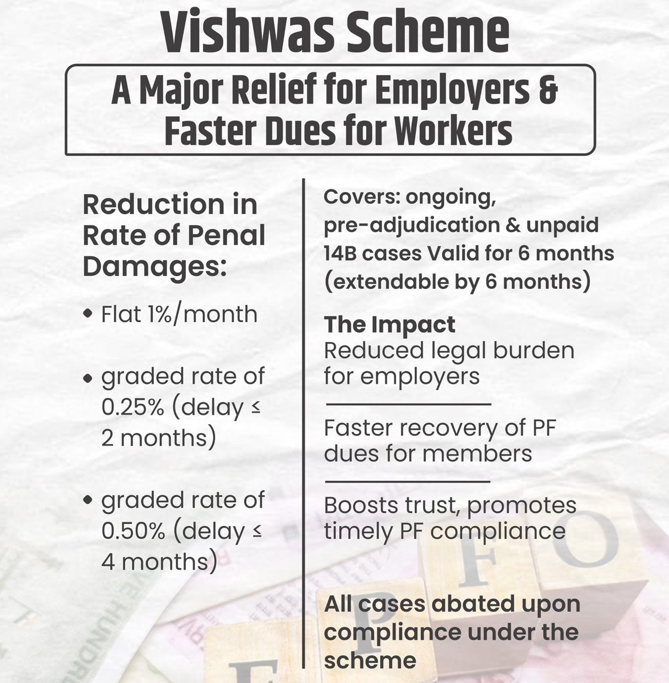 • ஊழியர்களின் வருங்கால வைப்பு நிதி (EPF) நிலுவைத் தொகை தொடர்பான வழக்குகளைக் குறைப்பதை விஸ்வாஸ் திட்டம் நோக்கமாகக் கொண்டுள்ளது.