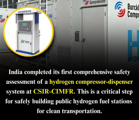 அறிவியல் மற்றும் தொழில்துறை ஆராய்ச்சி சபை - மத்திய சுரங்க மற்றும் எரி பொருள் ஆராய்ச்சி நிறுவனம் (CSIR-CIMFR) இந்தியாவின் முதல் ஹைட்ரஜன் அழுத்த உயர்த்தி - வெளியீட்டு எந்திரத்தின் முழு-அமைப்பு பாதுகாப்பு மதிப்பீட்டை நடத்தி உள்ளது.