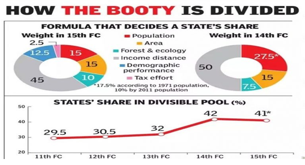 - 15வது நிதி ஆணையமானது 2021–2026 ஆம் ஆண்டிற்கு மாநிலங்களுக்கு 41% வரிப் பகிர்வைப் பரிந்துரைத்திருந்தது.