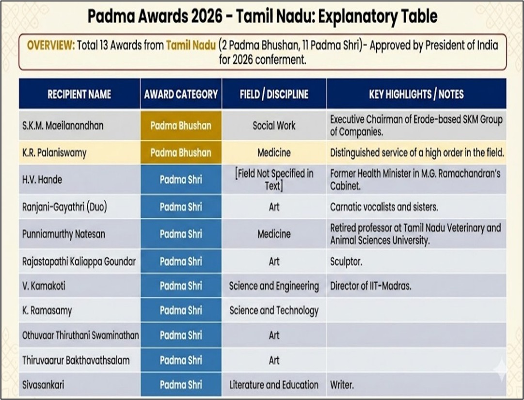 இந்தியக் குடியரசுத் தலைவர், தமிழ்நாட்டைச் சேர்ந்த 13 பேருக்கு 2026 ஆம் ஆண்டுக்கான பத்ம விருதுகளை வழங்குவதற்கு ஒப்புதல் அளித்துள்ளார்.
