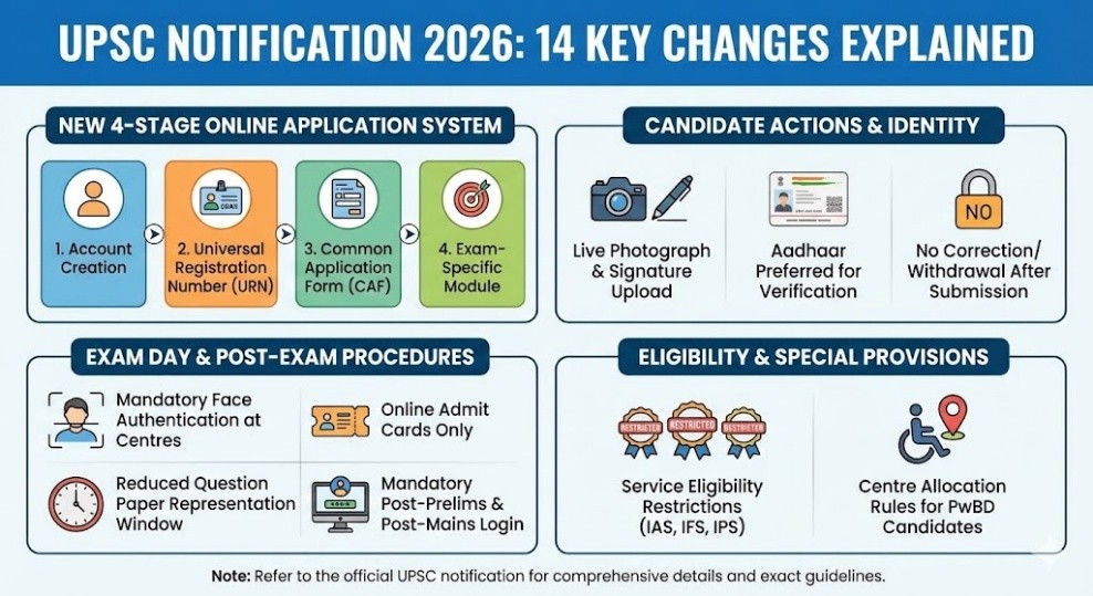 மத்திய அரசுப் பணியாளர் தேர்வாணையத்தின் (UPSC) 2026 ஆம் ஆண்டுக்கான குடிமைப் பணிகள் தேர்வு அறிவிப்பு, தேர்வில் 14 முக்கிய மாற்றங்களை அறிமுகப் படுத்தியுள்ளது.