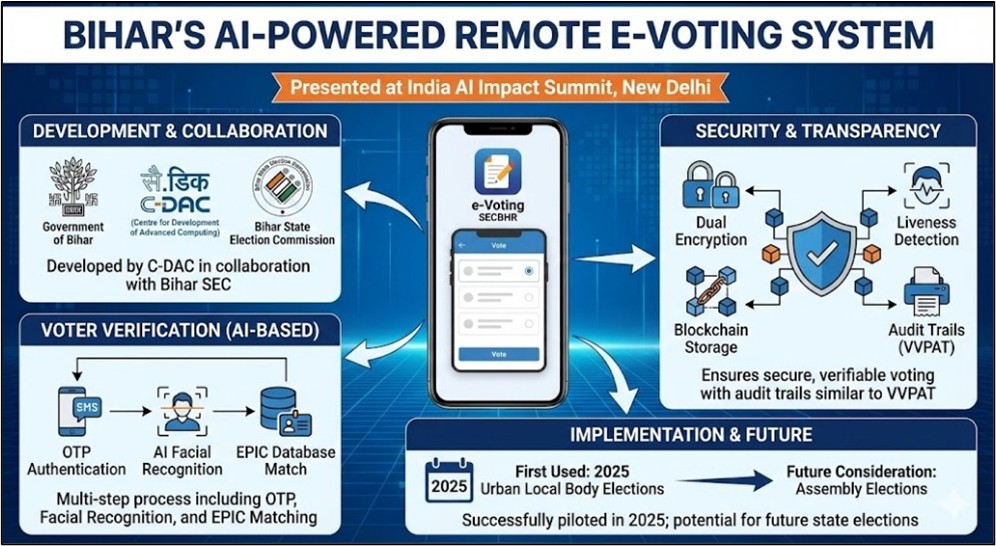 புது தில்லியில் நடைபெற்ற இந்தியா AI தாக்க உச்சி மாநாட்டில் பீகார் ஒரு செயற்கை நுண்ணறிவு (AI) -செயல்படுத்தப்பட்ட தொலைதூர மின்ணனு வாக்களிப்பு முறையை அறிமுகப்படுத்தியது.