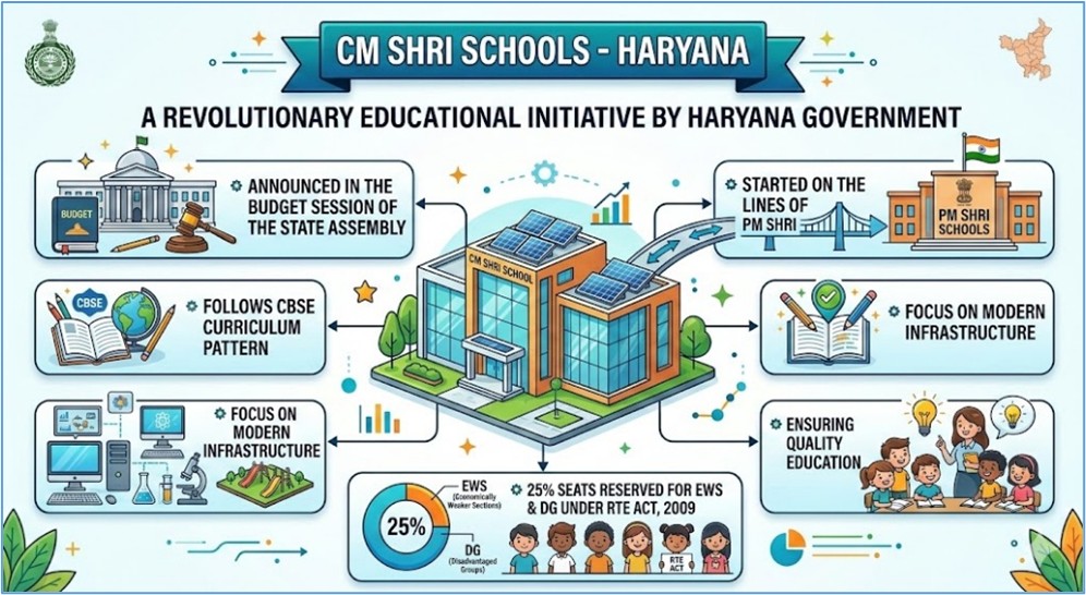 • ஹரியானா அரசு, மாநிலச் சட்டமன்றத்தின் பட்ஜெட் கூட்டத்தொடரின் போது CM Shri  பள்ளிகளைத் தொடங்குவதாக அறிவித்தது.