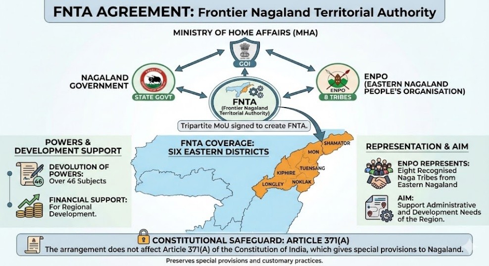 • எல்லைப்புற நாகாலாந்து பிராந்திய ஆணையத்தை (FNTA) உருவாக்குவதற்கான முத்தரப்பு புரிந்துணர்வு ஒப்பந்தத்தில் ஒன்றிய அரசு கையெழுத்திட்டது.