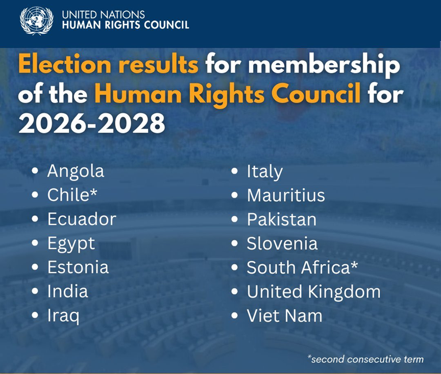 - 2026–2028 ஆம் காலகட்டத்திற்கான ஐக்கிய நாடுகள் மனித உரிமைகள் சபைக்கான (UNHRC) அங்கத்துவத்திற்கு இந்தியா போட்டியின்றி தேர்ந்தெடுக்கப்பட்டுள்ளது.