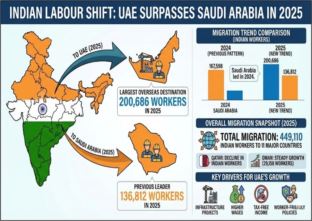 - 2025 ஆம் ஆண்டில், 200,686 இந்தியத் தொழிலாளர்கள் ஐக்கிய அரபு அமீரகத்திற்குப் புலம்பெயர்ந்த அதே சமயம் சவுதி அரேபியாவிற்கு 136,812 பேர் மட்டுமே சென்றனர்.