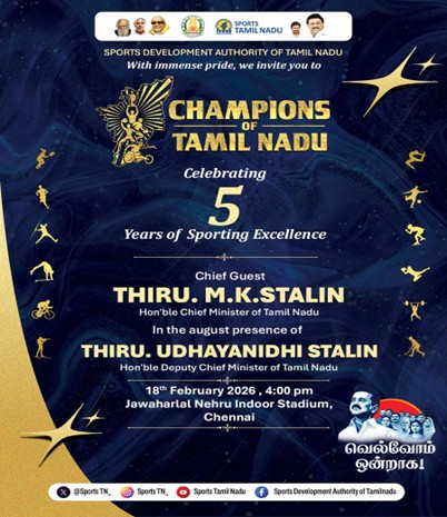 - சென்னையில் நடைபெற்ற ‘சாம்பியன்ஸ் ஆஃப் தமிழ்நாடு’ நிகழ்வில் தமிழ்நாடு ஐந்து ஆண்டு கால விளையாட்டு சாதனைகளைக் கொண்டாடியது.